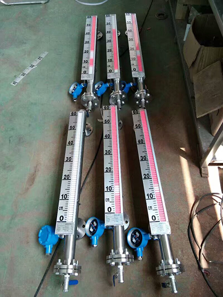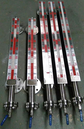 液位計根據浮力原理,浮子在測量管內隨液位的升降而上下移動,浮子內的永久磁鋼通過磁耦合作用,驅動紅、白色翻柱翻轉180’液位上升時,翻柱由白色轉為紅色,下降時,翻柱由紅色轉為白色,從而實現液位的指示。