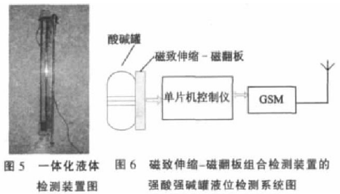 目前,工業用濃酸、濃堿液罐內的液位檢測手段,主要有超聲波液位檢測儀、磁翻板液位計、接觸式防腐蝕液位檢測裝置等。2007年05月,作者參觀了山西省陽城電廠,對陽城電廠的酸堿罐液位檢測裝置進行了考察;該廠現有大小20余個酸堿罐中酸堿液位的檢測,大都采用超聲波液位計與磁翻板液位計相結合的方式。超聲波液位計對酸堿液位信息通過線路傳輸到計算機,進行實時觀測。但據該廠技術人員介紹,超聲波液位計有一個致命缺點,就是安裝在罐頂部的超聲波探頭很容易被酸霧或堿霧籠罩,嚴重影響了測量準確度,需要工作人員定時對超聲波探頭進行清洗。磁翻板液位計沒有數據的自動傳輸功能,需要工作人員定時地去觀察液位刻度。為了確保酸堿液位數據的可靠性,該廠技術人員提出增加一套液位檢測裝置的要求,并能實現數據的自動化遠程傳輸。為此,作者利用磁致伸縮傳感器和磁翻板相結合的辦法,以求實現酸堿液位的非接觸式測量,并利用單片機和GSM技術,實現磁致伸縮液位信號的無線傳輸。