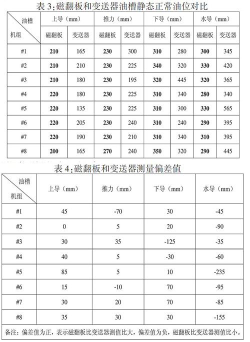 3)通過表3、表4,可以看出磁翻板耐酸堿磁翻板液位計廠家油位和變送器油位測值存在偏差,導致變送器油位測值不能直接反映油槽實際油位的高低,需要結合磁翻板和變送器的偏差值才能得出油槽實際油位,故建議下個檢修期時重新修正油位變送器的量程,使靜態下變送器油位測值與磁翻板油位保持一致,運行時能夠直接反映油槽實際油位的高低;