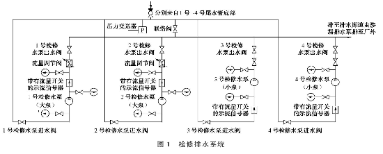 每臺檢修水泵均配置逆止閥、壓力表和帶流量開關的示流信號器,在1號、2號水泵出水管處各安裝了一個流量調節閥。系統中共有2根總管,一根為水泵的總吸水管,包括從每臺機組尾水管底部至總管的支管,總吸水管和部分支管及管路上的操作閥門布置在廠房管路廊道中;另一根為總排水管,可將水排至滲漏集水井中,再經滲漏排水泵排至下庫。