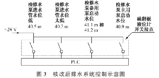 水位點40.9 m、41.1 m、41.2 m的開關量有上升自保持功能;水位點40.3 m、40.5 m的開關量有下降自保持的功能。技改過程中保留了壓力變送器的接線,讓其模擬量繼續上送上位機,只作為顯示用,但在檢修排水系統邏輯中取消壓力變送器控制檢修水泵的啟停功能,邏輯里增加了由浮子開關來控制檢修水泵的啟停過程。由于在磁浮球液位計的進水接口法蘭處安裝有