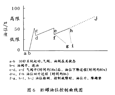 編程實現計算機畫面實時顯示油位(0% ~100%)和油位高、低的報警功能。我們用差壓法測量貯罐油位,如圖6所示,開氣閥時,油位回落較快;關氣閥時,油位上升緩慢(每小時7%)。可以將工作油位高位設在65%,油位從該點升至*限高位(80%),用時估計為2h。工作油位低位在55%~60%處,預警時間將提前20s以上,工作控制油位整體提高也利于潤滑設備的安全。因此,設定油位低于60%作為關閉氣閥條件,高于65%作為打開氣閥條件,用雙位式調節法代替原來的延時選通位式調節,控制油位在一定范圍內。保留了原有油位故障處理程序。