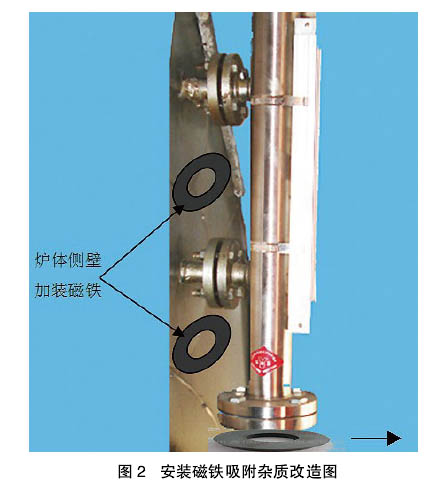 (圖2)。通過吸附作用減少進入水位計缸體的雜質,使水位計清理周期延長到5-7天。在此基礎上,又在水位計缸體底部法蘭外側加裝了1塊磁鐵,使水位計清理周期進一步延長為7一10天。