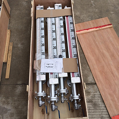 液位計根據浮力原理,浮子在測量管內隨液位的升降而上下移動,浮子內的永久磁鋼通過磁耦合作用,驅動紅、白色翻柱翻轉180’液位上升時,翻柱由白色轉為紅色,下降時,翻柱由紅色轉為白色,從而實現液位的指示。