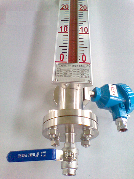 在浮子液位計上安裝變送器,通過浮子上下移動,經磁耦合作用使導桿內測量元件依次動作,獲得電阻信號變化,轉換成0~10mA或4~20mA的標準信號輸出,與顯示儀表或計算機連接,達到遠傳目的。