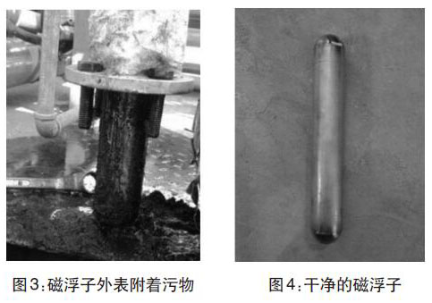 經過兩年多運行,污水罐內可能沉淀污泥雜質導致液位計示數不準。現場拆卸液位計,并且對浮球和磁浮子進行清洗。(圖3-圖4)