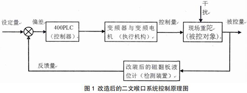 從圖 1 中可以看到改造后的系統采用帶負反饋的閉環控制原理,通過反饋系統使系統的精確度提高,響應時間縮短。當受控客體受干擾的影響,其實際狀態與期望狀態出現偏差時,控制主體將根據這種偏差發出新的指令,以糾正偏差,抵消干擾的作用。