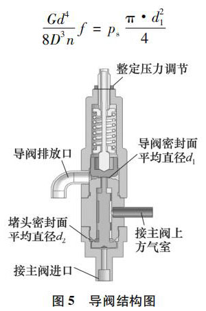 忽略重力和摩擦力因素的影響,對導閥的動作過程進行受力分析,導閥結構如圖 5 所示。當系統壓力升高達到整定壓力時,氣體在導閥密封面處克服導閥彈簧預緊力向上頂起導閥的閥芯,此時應滿足: