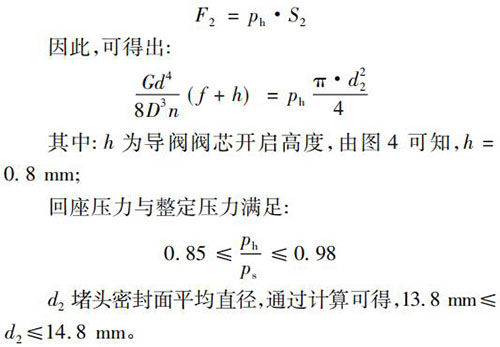 當系統壓力降低到回座壓力時,導閥彈簧要克服堵頭密封面處的密封力將其打開,此時應滿足: