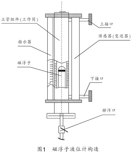 遠傳式硝酸液位計由磁浮子、工作筒、指示器、遠傳變送器組成,如圖 1 所示。