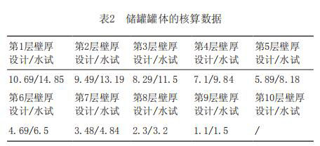 根據(jù)GB50341-2014《立式圓筒形鋼制焊接油罐設(shè)計(jì)規(guī)范》中的規(guī)定,儲罐內(nèi)徑小于60m,采取的是定設(shè)計(jì)點(diǎn)發(fā)進(jìn)行核算[3],核算出的儲罐的每層罐壁的所需厚度(mm)(設(shè)計(jì)與試水條件下)見表2。