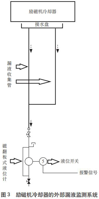 實(shí)際運(yùn)行經(jīng)驗(yàn)表明,防凍液位計(jì)內(nèi)部銅管發(fā)生泄漏的概率較低,但一旦發(fā)生泄漏,漏液會(huì)隨著冷卻空氣沿閉合風(fēng)路進(jìn)入勵(lì)磁機(jī)內(nèi)部,造成勵(lì)磁機(jī)短路損壞的嚴(yán)重后果。為了保證機(jī)組安全,應(yīng)有冷卻器內(nèi)部銅管泄漏監(jiān)測裝置,然而現(xiàn)場沒有配置此類裝置。
