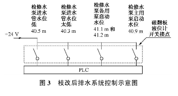 它結構是利用旁通管的原理,主導管內的液位和尾水管內的液位高度一致,根據阿基米德定理,磁性浮子在液體中產生的浮力和重力平衡,當尾水管中的水位升降時,液位計主導管內的浮子也隨之升降,浮子內的永久磁鐵通過磁耦合驅動指示器內的翻板指示器,當液位上升或下降時,翻板指示器由白色翻轉為紅色,或由原來的紅色翻轉為白色,指示器的顏色改變的高度就是被測水位的實際高度,從而實現液位的現場指示,以供運行人員目測尾水管的實時水位。安裝于液位計管壁外側的磁記憶開關,可多點設置、滑動調整位置,提供了液位開關量報警功能。在裝置的頂部安裝了一個自動排氣裝置,當主導管內液位上升時能夠自動的排氣,下降時能夠按時補氣。現場安裝耐高溫磁翻板液位計時,裝置標尺的0位,對應的實地高程為EL.40.0m。浮子開關設定5個水位動作值,檢修水位低開關量報警值對應的高程為40.3m;停止所有檢修水泵的開關量,所對應的高程為40.5m;啟動主用檢修水泵的開關量,所對應的高程為40.9m;啟動檢修水泵主用泵的開關量,以及要求手動啟動大泵,并作為水位高報警上送上位機,所對應的高程為41.1m與41.2m,兩個開關量并列接入。全部開關量分別送入PLC,如圖3所示。