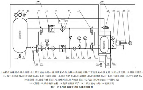 (1)循環(huán)油液控制回路,如圖2中100部分。這個(gè)部分主要由“保溫油箱、液位計(jì)、過(guò)濾器、循環(huán)油泵、加熱器、流量計(jì)、電動(dòng)三通閥、油水換熱器、齒輪油液位計(jì)、溫度傳感器等組成”;被試油箱滑油供回油口連接在試件箱內(nèi)供油軟管和回油軟管之間,即可對(duì)被試油箱內(nèi)部油液流動(dòng)要求及溫度進(jìn)行控制。