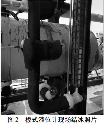 制冷系統(tǒng)調(diào)試運(yùn)行時,發(fā)現(xiàn)防霜磁翻板液位計的底部開始有氨氣泡形成,徐徐上升到液面消失,并且液面上下浮動,幅度較大,不能穩(wěn)定在某一位置內(nèi)。隨著系統(tǒng)的運(yùn)行,液位計的下部開始結(jié)露、結(jié)霜,結(jié)霜高度逐漸增加,并由霜轉(zhuǎn)化為冰,無法觀察到液位,見圖 2。同時,螺桿式制冷壓縮機(jī)出現(xiàn)了“潮車”現(xiàn)象。由于操作者無法判斷液位的準(zhǔn)確位置,為防止事故發(fā)生,被迫停機(jī),嚴(yán)重影響了物料的生產(chǎn)。
