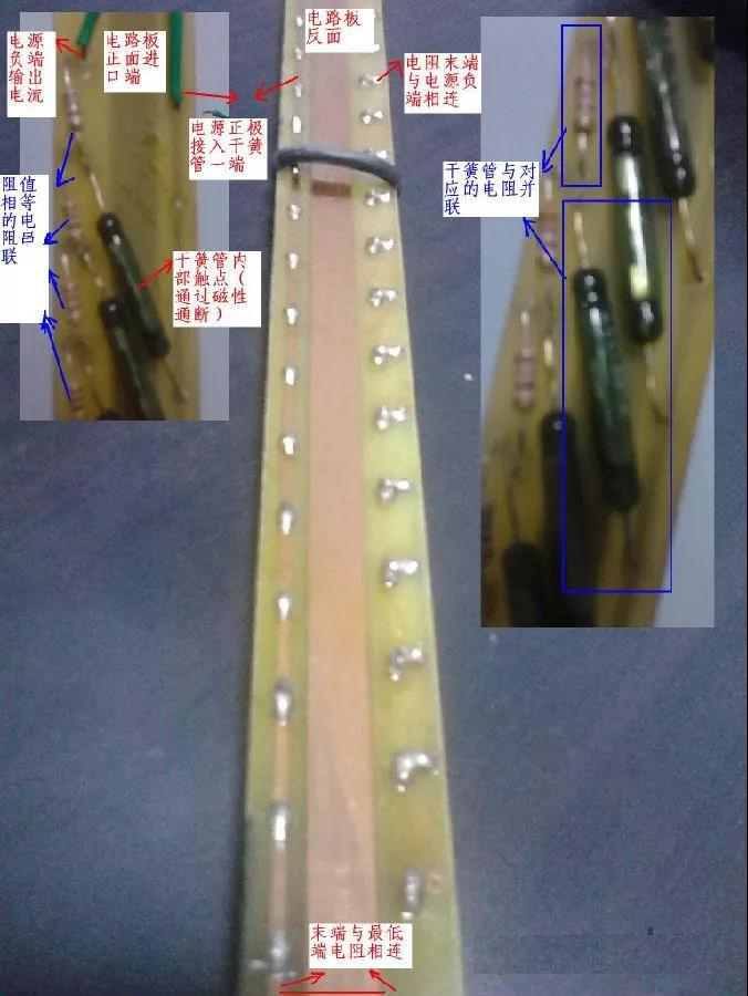 電阻測量電路板安裝在一個不銹鋼的護套管內(nèi),電路板由相同阻值的電阻串聯(lián)而成,每個電阻的末端與電路板電源進(jìn)線間并聯(lián)一個干簧管,干簧管內(nèi)部有一個對磁性敏感的小觸點,遇到磁浮子的磁性時觸點吸合,此干簧管以下的所有電阻被短路,電路板的電阻值變小使變送器輸出電流變大。磁浮子上升或下降后干簧管的觸點在釋放,此點的電阻恢復(fù)功能。