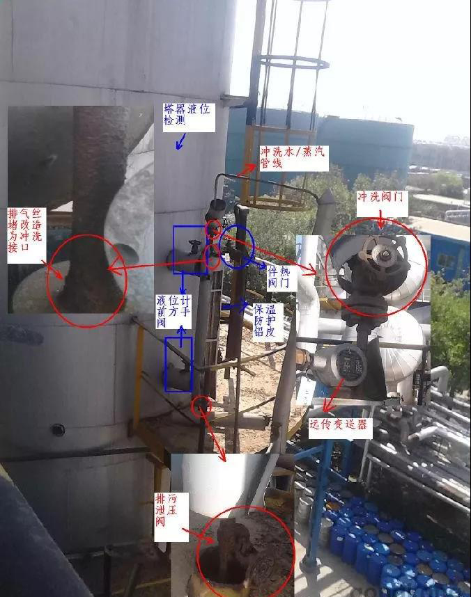 外裝式浮子液位計在實際清污中,對于現(xiàn)場安裝環(huán)境惡劣險峻不易拆卸的情況下,進(jìn)行維護改進(jìn)。利用測量筒上部的排氣絲堵,引進(jìn)蒸汽和清水管線,可以在不拆卸磁浮子的情況下進(jìn)行一定程度的除污清洗。