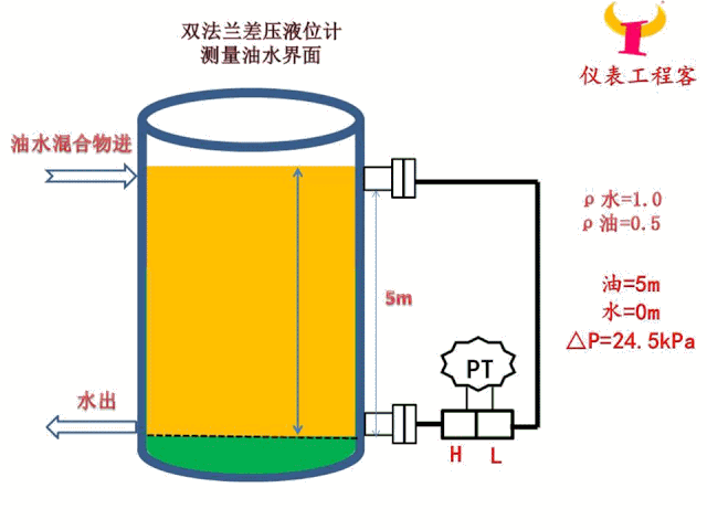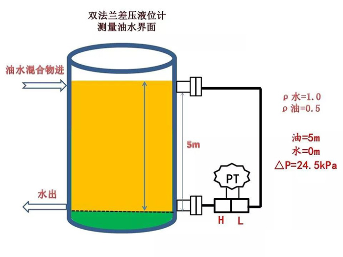 水的密度為1.0,油的密度為0.5,變送器的硅油密度為0.93,測(cè)量范圍5m,求油面在5m時(shí)變送器的差壓值。