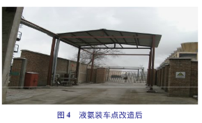 4)液氨裝車點移位改造。液氨裝車點不規范。根據相關要求,液氨裝車時,周圍不能有機動車通行,但液氨裝車點位于14號馬路西側5m處,對車輛及施工人員并無法完全封閉,裝車存在很大的安全風險。以前,液氨裝車由汽提崗位外操負責,由于外操工作繁忙,造成液氨裝車過程的監督時斷時續,為解決這一隱患,車間指派專人負責監管液氨裝車的全過程。監管人員不但要檢查接頭有無泄漏,還要核實駕駛員和押運員的資質。車間根據液氨裝車的實際情況,編制《液氨裝車泄漏應急操作卡》、《液氨裝車操作規程》,以便進一步規范液氨裝車操作程序。應分開設置液氨裝卸站的進出口,當進出口合用時,站內應設回車場。由于液氨裝車點東側5m處就是煉油區雨排系統,為了解決液氨裝車過程泄漏噴淋水污染公司煉油區雨排系統,在裝車點東西側各增設圍堰。從圖4可以看出:液氨裝車點改造后,現場更為規范,管理更為嚴格。